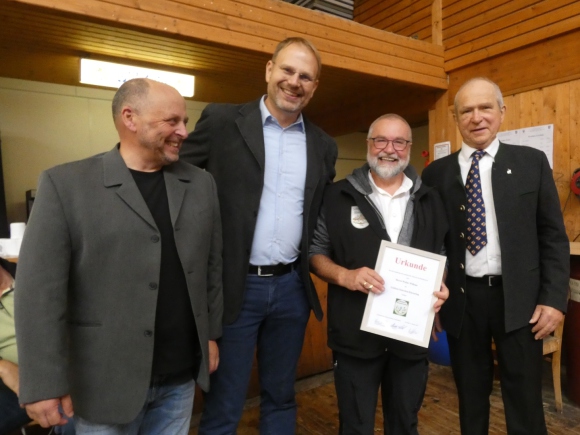 Recht viele Züchter versammelten sich am Samstagmorgen in dem bereits beschriebenen Nebenraum der Tierhalle zur Eröffnungsfeier. Dabei konnte Vorsitzender Jens Jadischke neben dem Schirmherrn der Veranstaltung, dem Landesverbandsvorsitzenden des LV Hannover Gerald Heidel, den LV-Ehrenvorsitzenden Hans-Heinrich Müller, den LV-Clubobmann Tobias Nöppert, die Referentin der ZDRK-Clubabteilung Katharina Halter und den Arbeitskreisleiter Thomas Schmitt begrüßen. Auch den zahlreich anwesenden Ehrenringträgern vergangener Jahre hieß er ein herzliches Willkommen. In diesem Zusammenhang ist besonders zu erwähnen, dass die drei Erstgenannten die bisherige Veranstaltung sehr aktiv unterstützt hatten. Gerald Heidel war verantwortlich für die EDV, Hans-Heinrich Müller stand nach eigenem Bekunden letztmalig bei einer großen Schau als Preisrichterobmann zur Verfügung und Tobias Nöppert war tags zuvor Preisrichter. Jens Jadischke bedankte sich eingangs bei den Ausstellern für das sehr gute Meldeergebnis und die große Unterstützung, die er von seinen Mitgliedern und den Zuchtfreunden des Kreisverbandes Leine-Weser und des Rasse-Kaninchenzuchtvereins F95 Nienburg/Weser e.V. erfahren habe. Der bisherige reibungslose Ablauf sei Beweis für ein fruchtbares Miteinander. Schirmherr Gerald Heidel sagte, dass ihm erstmals „vor seiner Haustür“ eine Schirmherrschaft angetragen worden sei. Als Landesverbandsvorsitzender und hiesiger Kreisverbandsvorsitzender kenne er die Strukturen und da in der DEULA bereits oftmals LV-Schauen ausgerichtet worden seien, habe er gerne den Club in „seinem Wohnzimmer“ unterstützt. EDV-technisch habe er schon alle Tiere „kennen gelernt“ und bei einem ersten Rundgang habe er eine hohe und beeindruckende Leistungsdichte der Zuchten bestaunen dürfen. Anschließend war es für Tobias Nöppert als Clubobmann wohl spürbar eine Herzensangelegenheit, die Scheckenfamilie begrüßen zu dürfen. Dabei sagte er, dass Clubvergleichsschauen aller Rassen einen sehr hohen Stellenwert im Ausstellungsgeschehen hätten. Hier erfolge auch regelmäßig die Weichenstellung für die Weiterentwicklung von Rassen. Kaum ein anderer Club schaffe allerdings eine derartige Darstellung und regelmäßige Präsentation wie die Scheckenclubs im ZDRK. Den Blick richtete er auch auf immer schwieriger werdende Zeiten und appellierte zum freundschaftlichen Zusammenhalt in der Clubarbeit. Arbeitskreisleiter Thomas Schmitt ging zunächst auf die Widrigkeiten ein, mit denen in den letzten Jahren die Rassekaninchenzucht zu kämpfen hatte. Nach Corona seien es explodierende Kosten gewesen, die fast jede Veranstaltung mit einem Fragezeichen versehen hätten und so auch Planungen in die Zukunft nicht unterschätzt werden dürften. Deshalb müsse man hier und heute glücklich sein, dass die Veranstaltung schon im seit Jahrzehnten gepflegten Rahmen stattfinden könne. Zu diesem Rahmen gehöre auch die Tradition, an einen verdienten Scheckenzüchter den „Goldenen Schecken-Ehrenring“ zu verleihen. Diese Ehre wurde in diesem Jahr Joachim Bogner aus dem LV Baden zuteil. Mit Bedauern teilte der Arbeitskreisleiter mit, dass der zu Ehrende kurzfristig erkrankt sei und nicht anwesend sein könne. Deshalb nahm Clubvorsitzender Jan Hennig Andresen die Ehrung entgegen. In seiner Laudatio auf den Geehrten erinnerte Thomas Schmitt an Stationen des Wirkens unseres Zuchtfreundes: 1985 trat er in den Scheckenclub Baden ein. Schon 1992 gehörte er dem Organisationsteam zur Durchführung der Clubvergleichsschau in Pforzheim-Huchenfeld an. 1993 wurde er Vorsitzender des Scheckenclubs Baden und mit Gründung des Arbeitskreises deutscher Scheckenzüchter im Jahre 1995 wurde er Mitglied der Arbeitskreisleitung. Als „anpackender“ Züchter und Mann der ersten Stunden wirkte er an der Ausgestaltung des Handlungsrahmens mit. Maßgeblich hatte er die Idee zum „Goldenen Schecken-Ehrenring“ und kreierte ein erstes Muster. Bis heute ist er für die Herstellung verantwortlich. Unter seiner Regie als Vorsitzender fand 2003 in Neuhausen die Clubvergleichsschau statt. 2007 endete seine Zeit als Vorstand, wurde zum Ehrenvorsitzenden ernannt und war bis 2022 noch stellvertretender Vorsitzender. Von Anfang an züchtete Joachim Bogner Englische Schecken, blau-weiß, und erzielte auf allen Ebenen große Ausstellungserfolge. Auch wenn er in den letzten Jahren etwas kürzer trat, ist und bleibt er ein auch überregional sehr geschätzter Zuchtfreund, der sich über Jahrzehnte neben seinen züchterischen Erfolgen in vielen Funktionen für die Scheckenzucht in Baden und Deutschland verdient gemacht hat. Das Bild mit Joachim Bogner entstand 14 Tage nach der Schau auf der Lokalschau seines Heimatvereins in Neuhausen. Die Urkunde wurde dort vom Vorsitzenden des Scheckenclubs Baden übereicht.